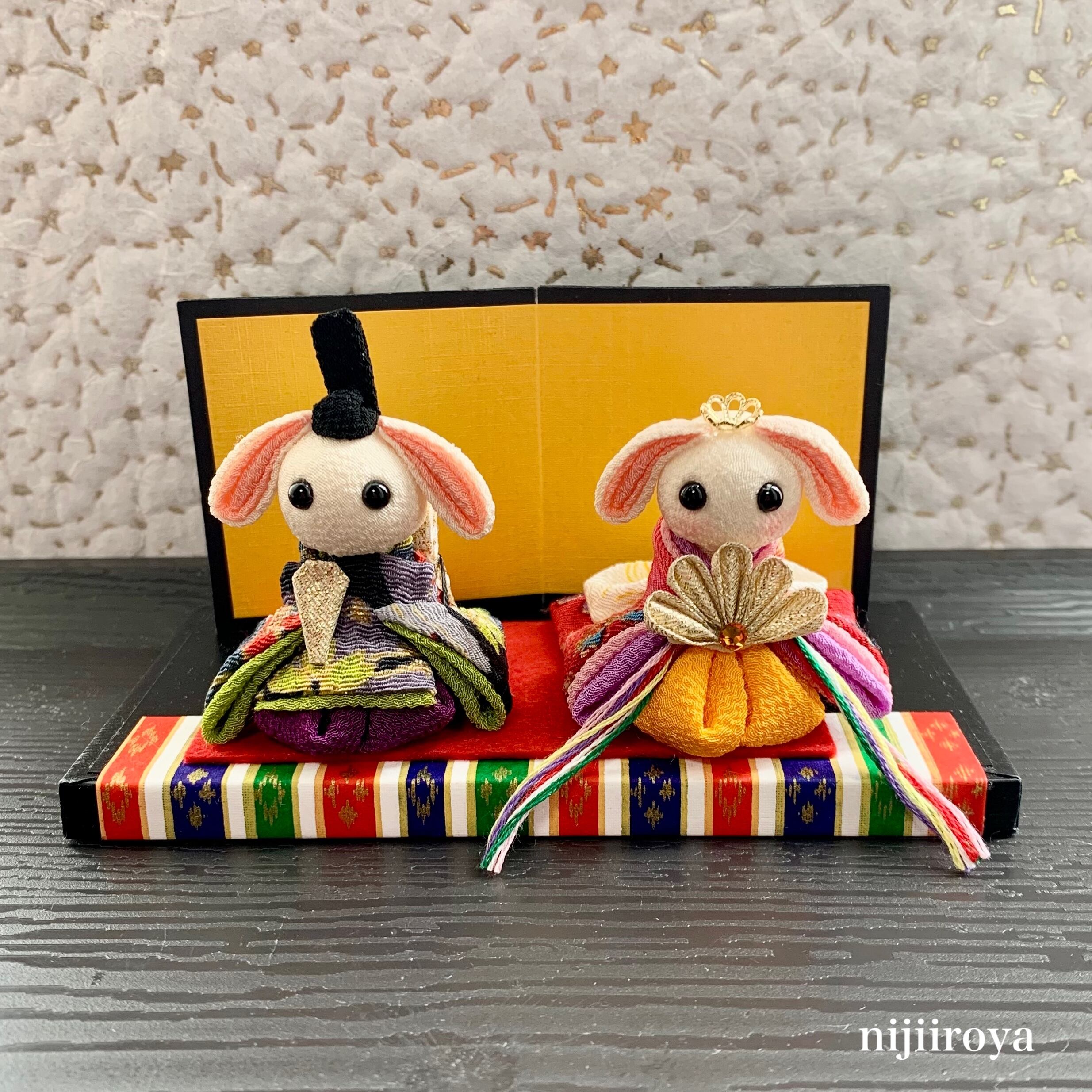 ちりめん生地を使いつまみ細工を取り入れたうさちゃんのお雛様を作りました。